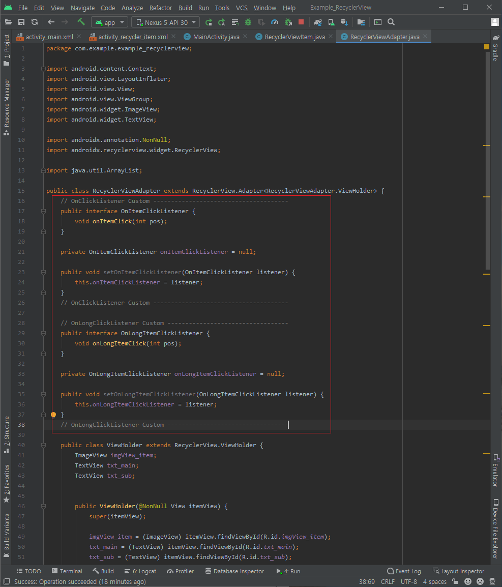 - RecyclerView 커스텀 구현부터 먼저 한 다음 따라해야함