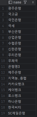 테스트로 은행 테이블을 만들어서 은행명을 기준으로 정렬하고 싶다.