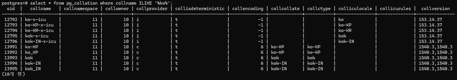 현재 pg_collation 테이블을 확인한 결과, ko_KR.UTF-8 같은 일반적인 collate 옵션이 없고, ICU 기반(ko-KR-x-icu) 또는 glibc 기반(ko-KP) 옵션만 있다.