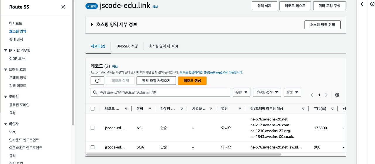 이렇게하면 Route53에서 등록된 도메인을 확인 할 수 있다.