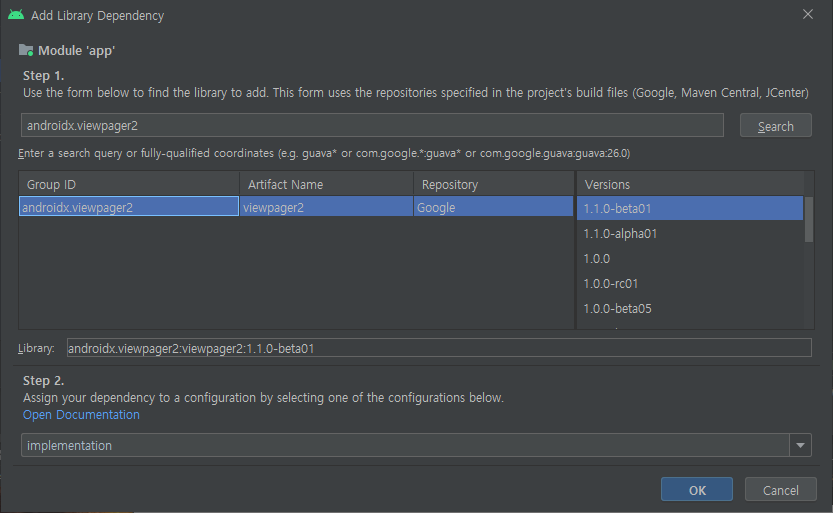 3. 설치하고자 하는 라이브러리 (androidx.viewpager2) 검색해서 오른쪽에 버전 선택 (최상단이 최신버전)