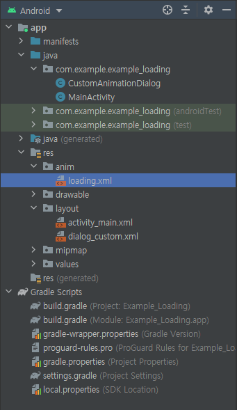 : res에 anim 디렉터리 만들고 loading.xml 파일 생성