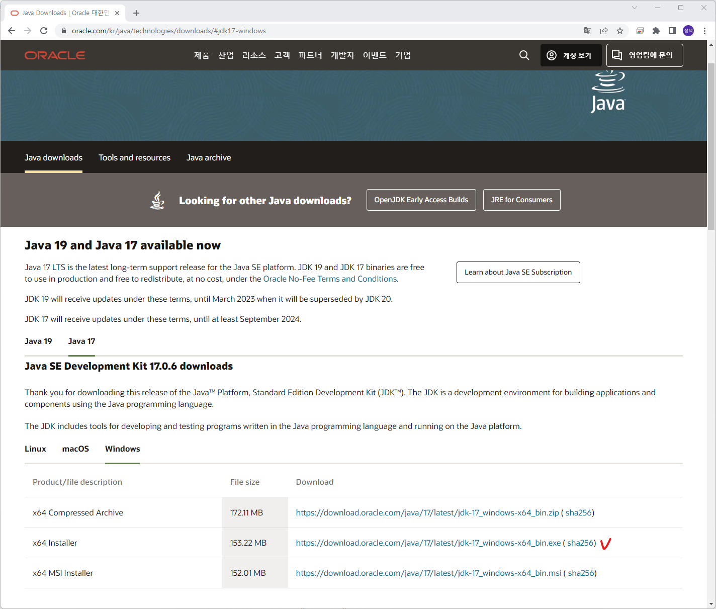 https://www.oracle.com/kr/java/technologies/downloads/#jdk17-windows