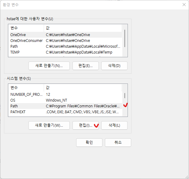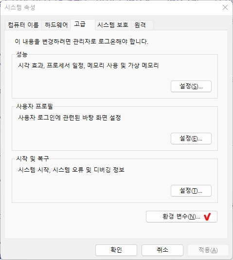 - 윈도우 검색창에 '환경 변수' 입력 > 시스템 환경 변수 편집
