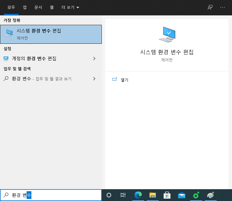 1. 검색에서 '환경 변수' 입력 후 '시스템 환경 변수 편집'