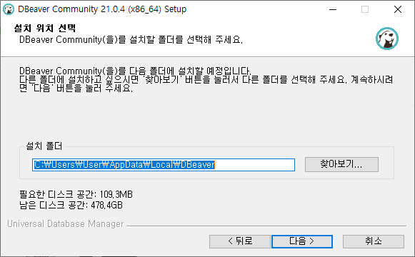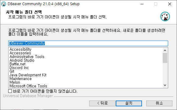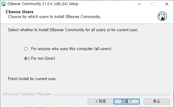 DBeaver Community를 설치할 사용자 선택 ( 모든 사용자용 / 현재 사용자용 )