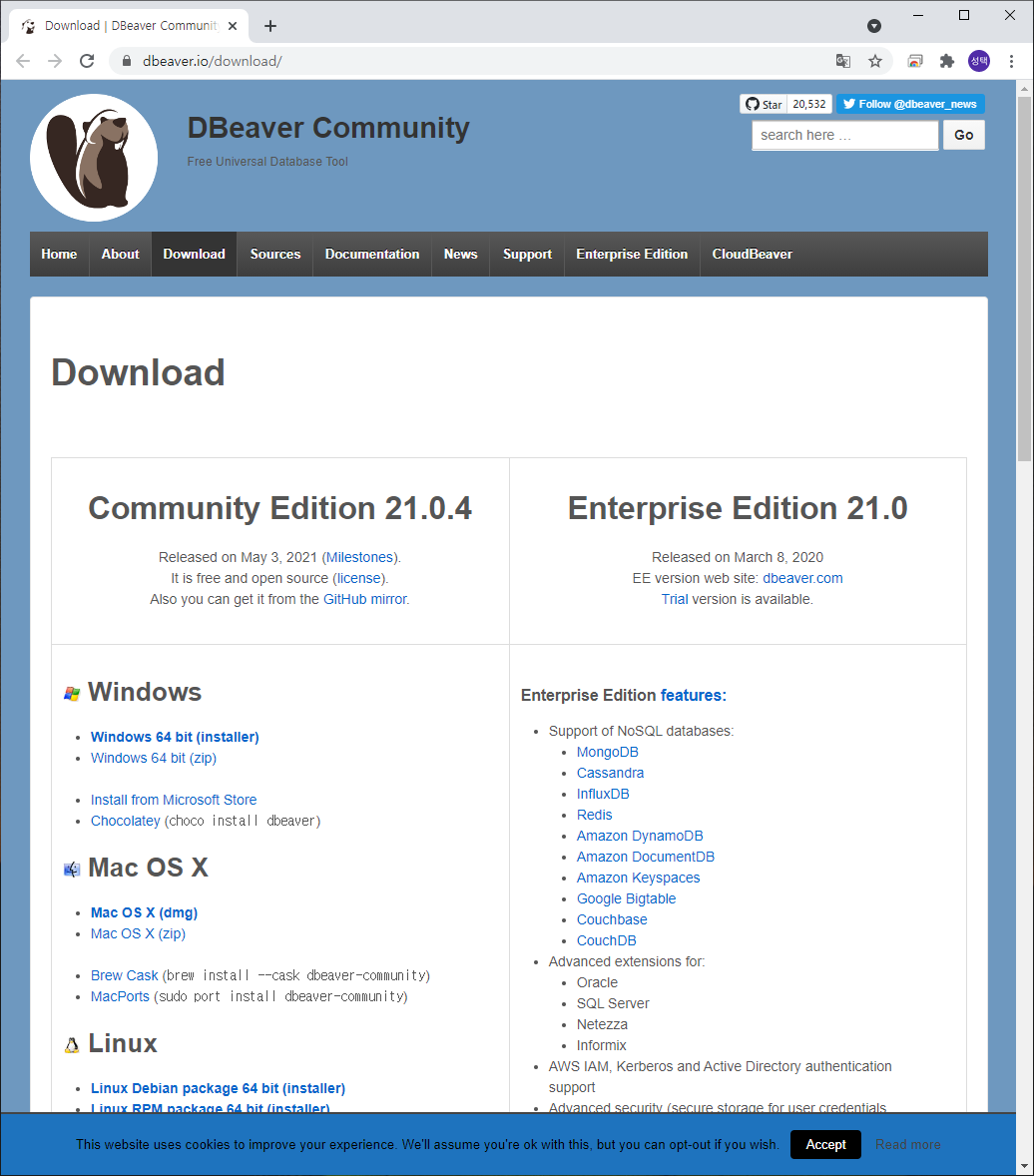 1. dbeaver.io/download/ 접속 : dbeaver 다운로드 홈페이지