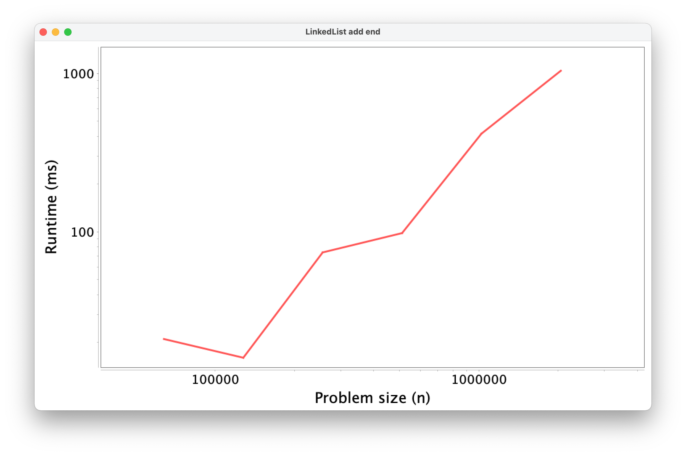 측정값에는 잡음이 많고 선은 완벽한 직선은 아니다. 추정 기울기는 1.21이고 요소를 시작에 추가하는 연산과 비슷하지만, 분석에서 추정한 2에는 가깝지 않다. 사실 이것은 1에 가까우며 요소를 끝에 추가하는 각 연산이 상수 시간임을 의미한다. 왜 그럴까?